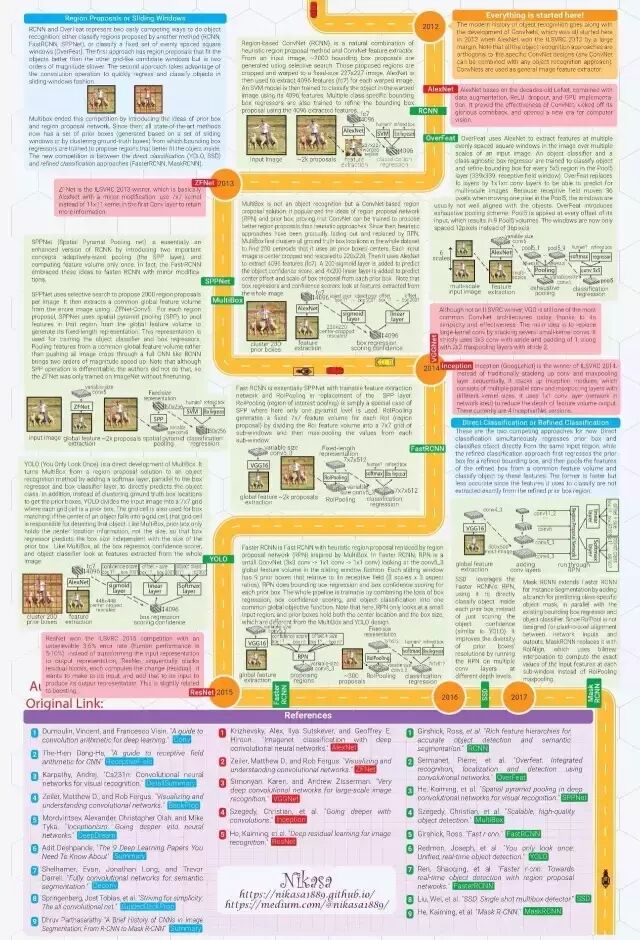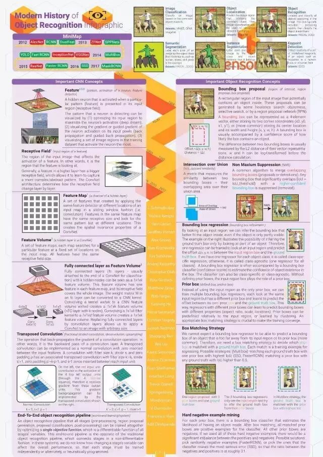我感觉每当计算机视觉识别方面有什么惊人的突破发生了,都得有人再讲一遍是怎么回事。这就是我做这个图表的原因。它试图用最简洁的语言和最有吸引力的方式讲述物体识别的现代史。故事开始于2012年 AlexNet 赢得了 ILSVRC(ImageNet大规模视觉识别挑战赛)。信息图由2页组成,第1页总结了重要的概念,第2页则勾画了历史。每一个图解都是重新设计的,以便更加一致和容易理解。所有参考文献都是精挑细选的,以便读者能够知道从哪里找到有关细节的解释。