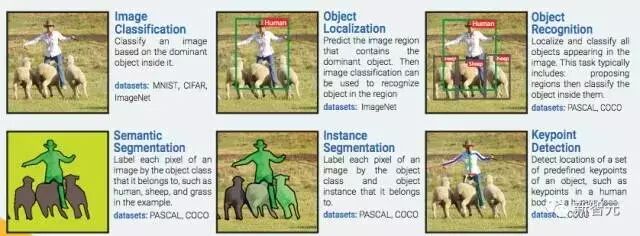 语义分割:把图像中的每一个像素分到其所属物体类别,在样例中如人类、绵羊和草地。数据集:PASCAL, COCO