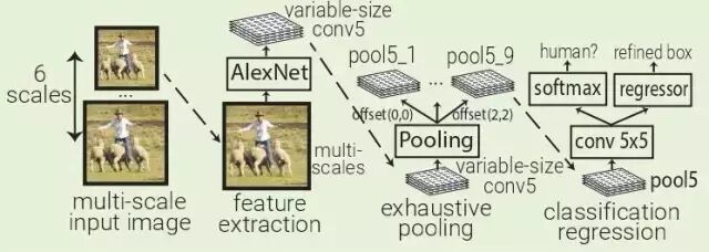 OverFeat:OverFeat使用AlexNet在一个输入图像的多个层次下的多个均匀间隔方形窗口中提取特征。训练一个对象分类器和一个类别不可知盒子回归器,用于对Pool5层(339x339接收域窗口)中每5x5区域的对象进行分类并对边界框进行细化。OverFeat将fc层替换为1x1xN的卷积层,以便能够预测多尺度图像。因为在Pool5中移动一个像素时,接受场移动36像素,所以窗口通常与对象不完全对齐。OverFeat引入了详尽的池化方案:Pool5应用于其输入的每个偏移量,这导致9个Pool5卷。窗口现在只有12像素而不是36像素。