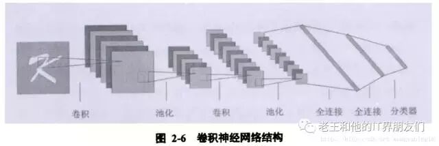 卷积神经网络主要包括两种神经层:卷积层(Convolution)和池化层(又称下采样层,Pooling)。这两层往往搭配出现。如图2-6所示一个典型的卷积神经网络模型一般包括数个卷积层与池化层的组合,在此之后的几层是神经网络的全连接层