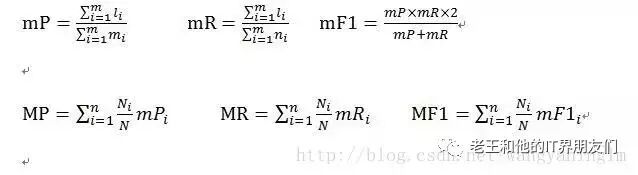 微平均和宏平均是计算全局的查准率,查全率和F1测试值的两种方法。其中,微平均用mP、mR、mF1来表示:宏平均用MP、MR、MF1来表示,公式如下: