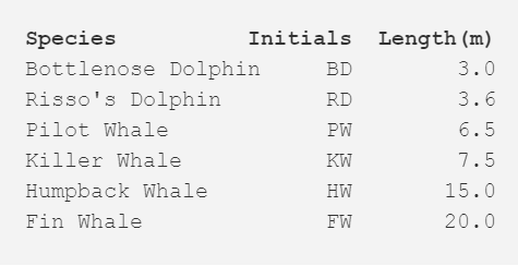 以下是关于鲸鱼或海豚物种分类的超简单数据集。作为受过专业教育的生物学家,通常我们会使用更加详尽的数据集构建系统。现在我们可以看看这六个物种的典型体长。本案例中我们将使用 2 次重复步骤。