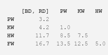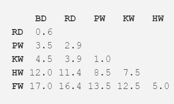 步骤一:计算每个物种之间的距离矩阵,在本案例中使用的是欧氏距离(Euclidean distance),即数据点(data point)间的距离。你可以像在道路地图上查看距离图一样计算出距离。我们可以通过查看相关行和列的交叉点值来查阅任一两物种间的长度差。