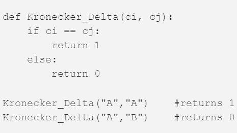 最后,我们再将括号中的项和 δc_i, c_j 相乘。δc_i, c_j 就是大名鼎鼎但基本无害的克罗内克 δ 函数(Kronecker-delta function)。下面是其 Python 解释: