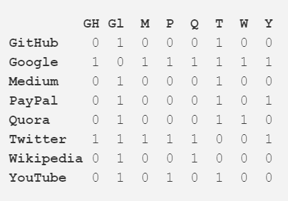 每行和每列的交点处的值表示对应的顶点对之间是否存在边。比如说,在 Medium 和 Twitter 之间有一条边,所以它们的行列交点是 1。类似地,Medium 和 PayPal 之间没有边,所以它们的行列交点是 0.