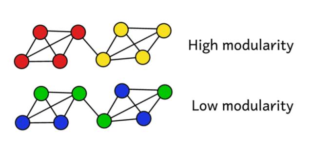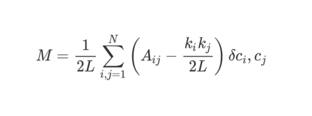当我们将括号中的项与克罗内克 δ 函数相乘时,我们发现对于嵌套求和 Σ,当有大量「意外的(unexpected)」连接顶点的边被分配给同一个聚类时,其结果是最高的。因此,模块性是一种用于衡量将图聚类成不同的团体的程度的方法。