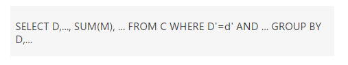 即对立方体按某些维度分组汇总某些测度。其中C是数据立方体,D,...是选出维度,M,...是聚合测度,聚合函数也可以不是SUM。D'是切片维度,切块时条件为D IN (d,...),WHERE中还可以增加针对某些测度的条件,一般也就是选出某个区间内的值。
