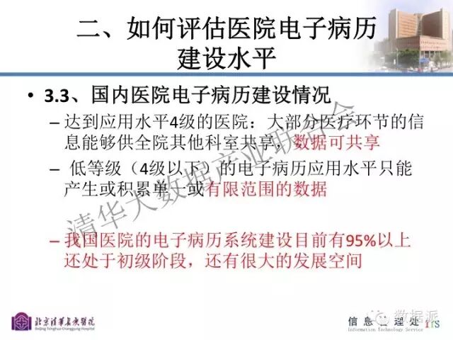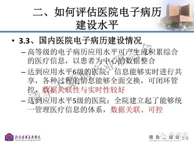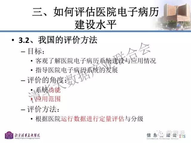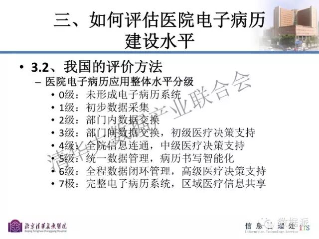 根据这个目标制定出来一个规范,从系统功能和应用的范围来做评价,这样的话,面上不是很全,但是至少主要的面到了。二是利用医院运行数据进行定量评估与分级,医院的数据是客观的,每天做了多少检查和检验都知道,这样就能比较好的把这个数据搜集起来。