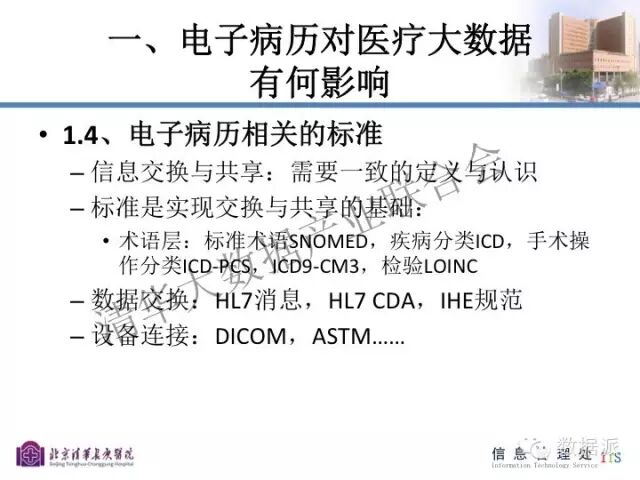 为了应用这些东西,人们也发现,现在的这些记录很难用,美国的问题比我们现在突出得多,因为很多应用,很多系统建立都比较早,病历当中包括很多交换、共享的标准,比如说提到标准的术语,疾病分类,手术操作,各种的项目,各种设备的连接,数据的交换,一部分检验也可以通过这些进行解决。