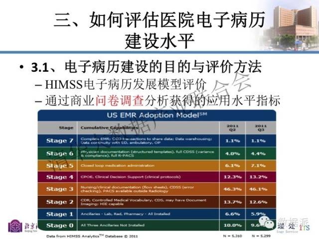 实际上评估有很多种方法,HIMSS也有一个电子病历发展模型评价,这个模型做得非常巧妙,因为本身它是一家商业的咨询公司,它把商业问卷调查分析产生出一个水平指标,这件事情做得非常巧妙,这样的话,能够评估出医院电子病历的水平,这也是一种方式。