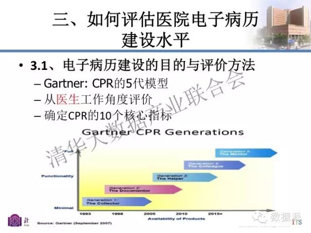 实际上有很多专业的公司也在对电子病历做评价,其中一个很著名的Gatner公司,他是很著名的咨询公司,他把电子病历分为5代模型,这5代模型实际上是画出时间表格的,从1993年开始做,他估计到现在,大概是做到第4代,可能在2015年或者2020年以后会逐渐有第5代的电子病历出现。