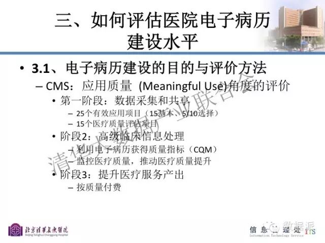 美国现在在做的,就是CMS,有点类似于我们的医保局,专门管医保的,给人付钱的,他在推动的Meaningful Use,他做了一个评估,其中第一个阶段有这么25个项目,和15个医疗质量评估项目,这些是从应用的目的看电子病历用得好不好,和前面的HIMSS评估只注重功能,是不太一样的。