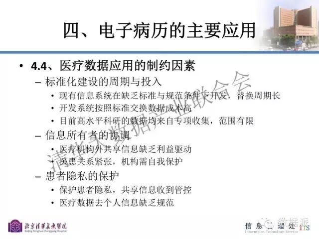要运用这些数据目前存在很多制约的因素,一是标准化的投入,实际上相当难,目前还很少有这样的机制。一所医院现在的标准是期望拿出医院运营费用的1%来做IT,但是实际上多数达不到,大概能到0.5%,0.6%,算下来也没有多少钱,一所医院十个亿的话,没有多少钱。