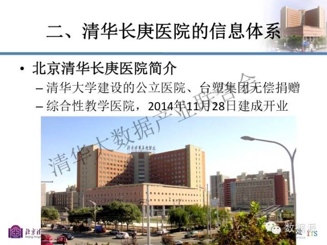 下面正好借次机会讲一下我现在所在的医院,我是从学校毕业以后在301干了20年,后来又到协和当信息中心主任。清华长庚医院是清华办的医院,由长江集团,台塑集团无偿的捐赠,是一所公立医院,这是11月28号刚刚建成开业,到今天是49天,也是一所新的医院,在天通苑。