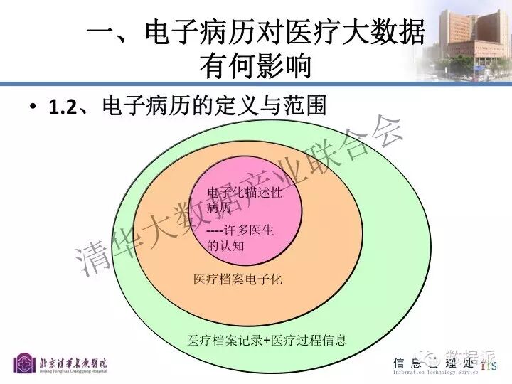 首先对电子病历的定义,大家的认识有很大差距,很多大夫对电子病历的认识往往就是中心的这一块儿,很多都是描述,写病程的记录,很多都是自由文本。很多的医院一说到我买了一个电子病历系统,实际上仅仅是这一块儿,类似于像WORD那样,代替医生拿纸和笔写病历。