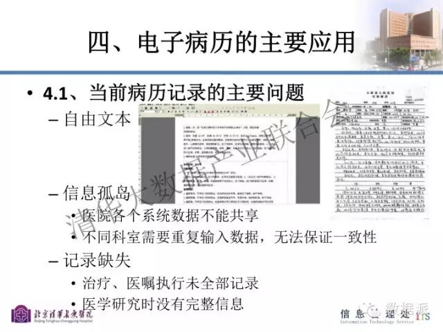第四个方面,电子病历目前怎么应用和主要的问题。医疗上的这些病历过去一直是手写,我们想从中抽取一些东西很困难,我在301做了20年,我知道很多医生研究的时候,做这项工作是很难的,病历当中大量描述性的东西想抽取都是很难的,也曾经想通过抽取关键词,但是实际上效果太低了。