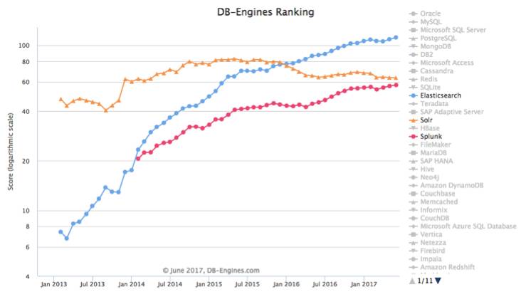 从趋势上来看,Elasticsearch 和 Splunk 上升明显,Elasticsearch 更是表现出了非常强劲的势头。