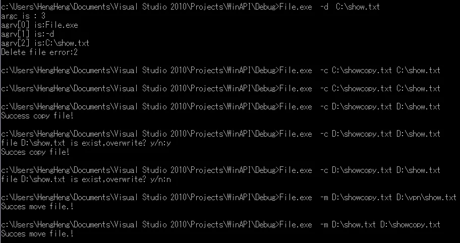 1 #include <Windows.h> 2 #include <stdio.h> 3 4 int main(int argc, PCHAR argv[]) 5 { 6 int i; 7 if(0 == lstrcmp("-d",argv[1]) && argc == 3) 8 { 9 if(!DeleteFile(argv[2])) 10 { 11 printf("argc is : %d",argc); 12 for (i = 0; i < 3; i++) 13 { 14 printf("\nagrv[%d] is:",i); 15 printf(argv[i]); 16 } 17 printf("\nDelete file error:%x\n",GetLastError()); 18 } 19 else 20 { 21 printf("argc is : %d",argc); 22 for (i = 0; i < 3; i++) 23 { 24 printf("agrv[%d] is:",i); 25 printf(argv[i]); 26 } 27 printf("Succes delete file!\n"); 28 } 29 } 30 31 else if(0 == lstrcmp("-c",argv[1]) && argc == 4) 32 { 33 if(!CopyFile(argv[2],argv[3],TRUE)) 34 { 35 if(GetLastError() == 0x50) 36 { 37 printf("file %s is exist,overwrite? y/n:",argv[3]); 38 if('y' == getchar()) 39 { 40 if(!CopyFile(argv[2],argv[3],FALSE)) 41 printf("Copy file error,%d\n",GetLastError()); 42 else 43 printf("Succes copy file!\n"); 44 } 45 return 0; 46 } 47 } 48 else 49 printf("Success copy file!\n"); 50 } 51 52 else if(0 == lstrcmp("-m", argv[1]) && argc == 4) 53 { 54 if(!MoveFile(argv[2], argv[3])) 55 printf("Move file error:%d\n",GetLastError()); 56 else 57 printf("Succes move file.!\n"); 58 } 59 else 60 printf ("argv is error! \n"); 61 }