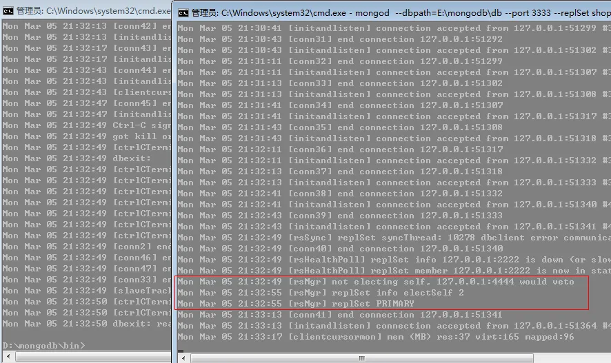 在3333端口的从属服务器即可顶上,最后大家也可以再次使用rs.status()来看下集群中服务器的状态。