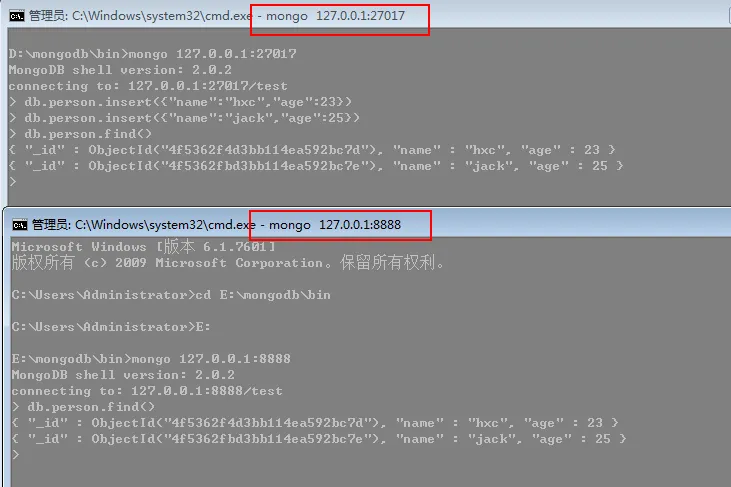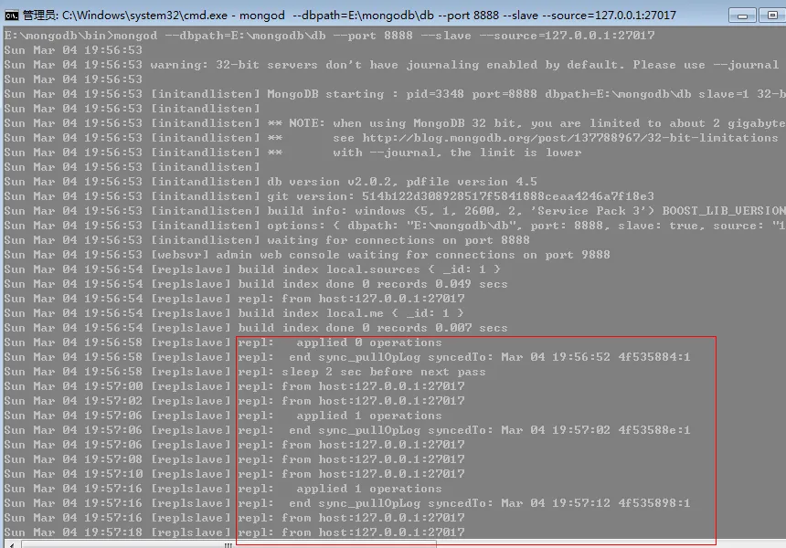 第三步:同样的方式启动E盘上的mongodb,指定该数据库为从属数据库,命令也很简单,当然我们要换一个端口,比如:8888。