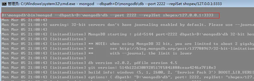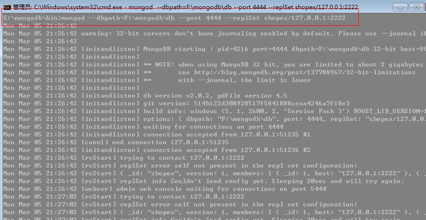 第一步: 既然我们要建立集群,就得取个集群名字,这里就取我们的公司名shopex, --replSet表示让服务器知道shopex下还有其他数据库,
