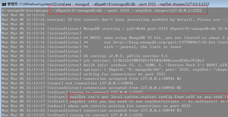 第三步: ok,看看上面的日志红色区域,似乎我们还没有做完,是的,log信息告诉我们要初始化一下“副本集“,既然日志这么说,那我也就