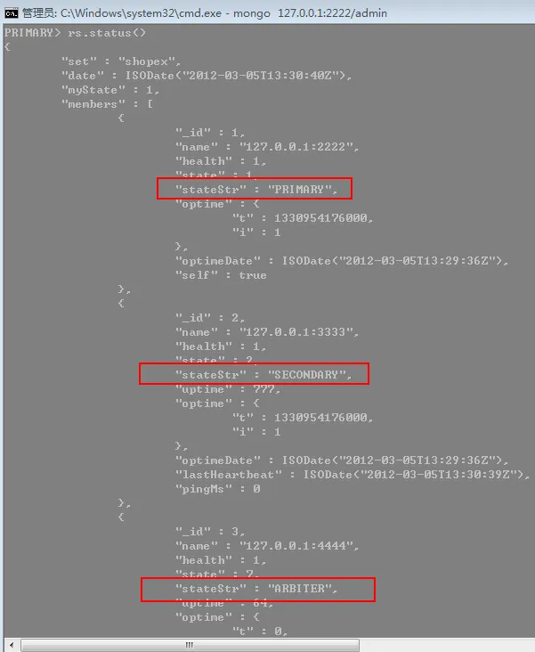 追加好了之后,我们使用rs.status()来查看下集群中的服务器状态,图中我们可以清楚的看到谁是主,还是从,还是仲裁。