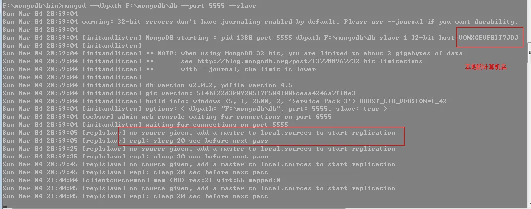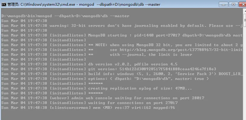 第二步:启动D盘上的mongodb,把该数据库指定为主数据库,其实命令很简单:>mongodb --dbpath='XXX' --master,