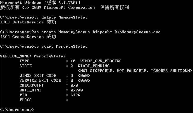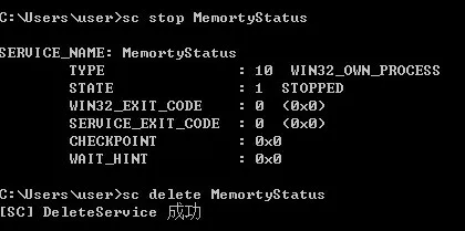 注意我这里在sc create MemortyStatus binpath= D:\MemoryStatus.exe里面有个拼写错误,MemoryStatus写成了MemortyStatus,多了个t,这个没关系,只要你在下面操作时候将错就错就行了。