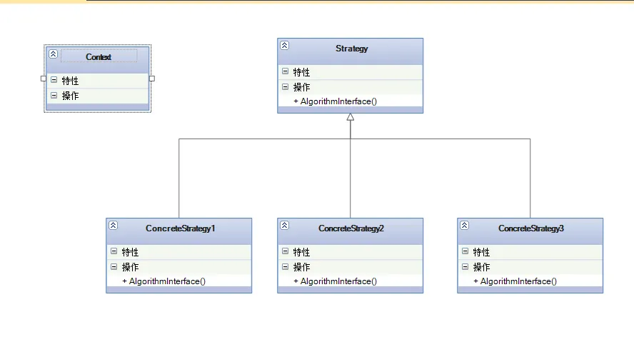 public class ConcreteStrategy1 : Strategy { public override void AlgorithmInterface() { Console.WriteLine("算法1的实现"); } } public class ConcreteStrategy2 : Strategy { public override void AlgorithmInterface() { Console.WriteLine("算法2的实现"); } } public class ConcreteStrategy3 : Strategy { public override void AlgorithmInterface() { Console.WriteLine("算法3的实现"); } }