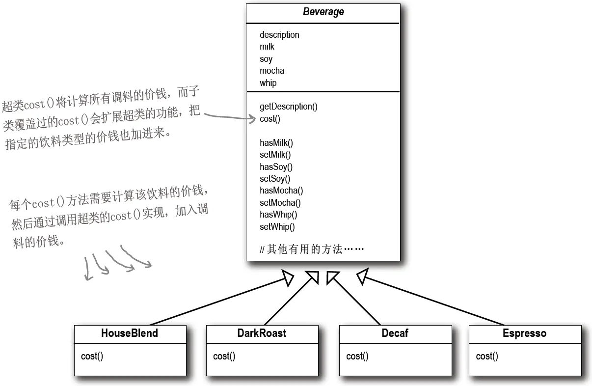 一旦出现新的调料,我们就需要加上新的方法,并改变超类中的cost()方法。