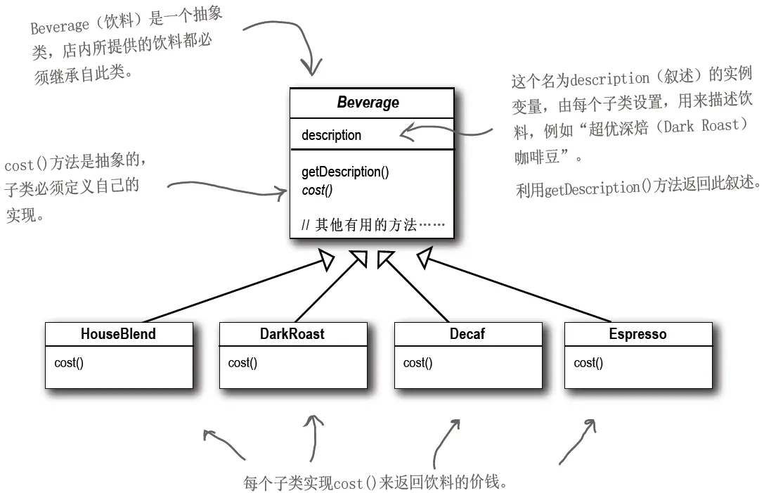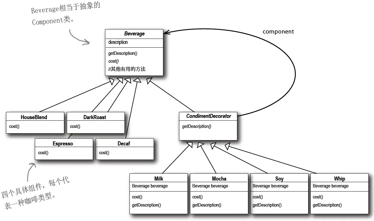 以饮料(Beverage)为主体,然后在运行时以调料(Condiment)来装饰(decorate)饮料