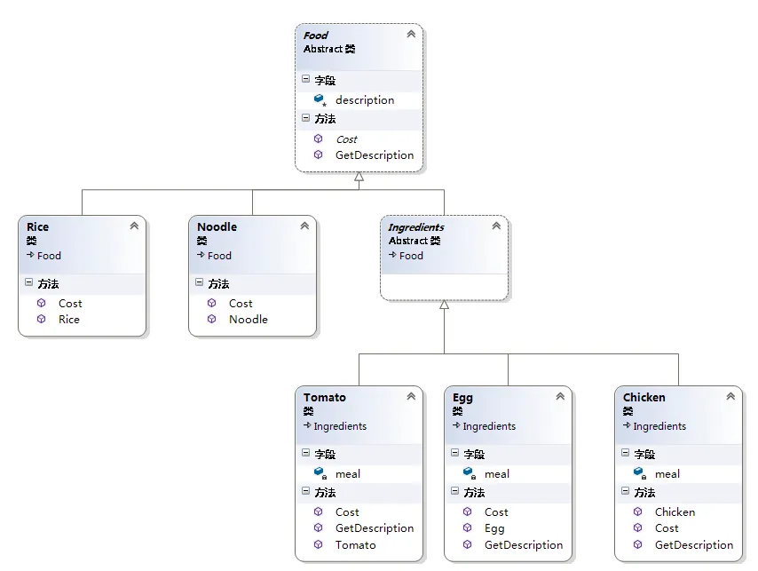 1 /// <summary> 2 ///抽象类 食物基类 其他类都继承自该类 3 /// </summary> 4 public abstract class Food 5 { 6 protected string description = "未知的饭"; 7 public virtual string GetDescription() 8 { 9 return this.description; 10 } 11 public abstract double Cost(); 12 }