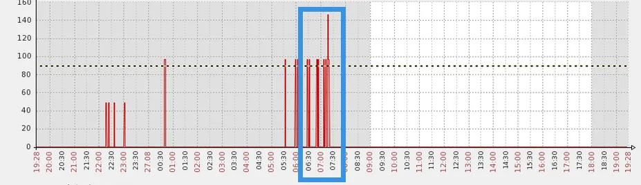首先的考虑就是后台的scheduler,结果查看还是默认的晚上10点左右,所以到早上的那个时间段应该不会有直接的影响。