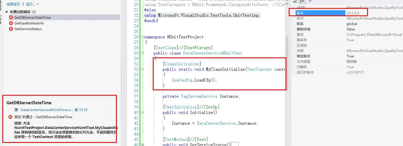 版本为9.0.0.0 的话,则使用[ClassInitialize]会该方法必须是静态的公共方法,不返回值并且应采用一个TestContext类型的参数报错!不知道是否是微软的BUG。