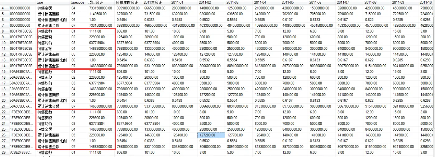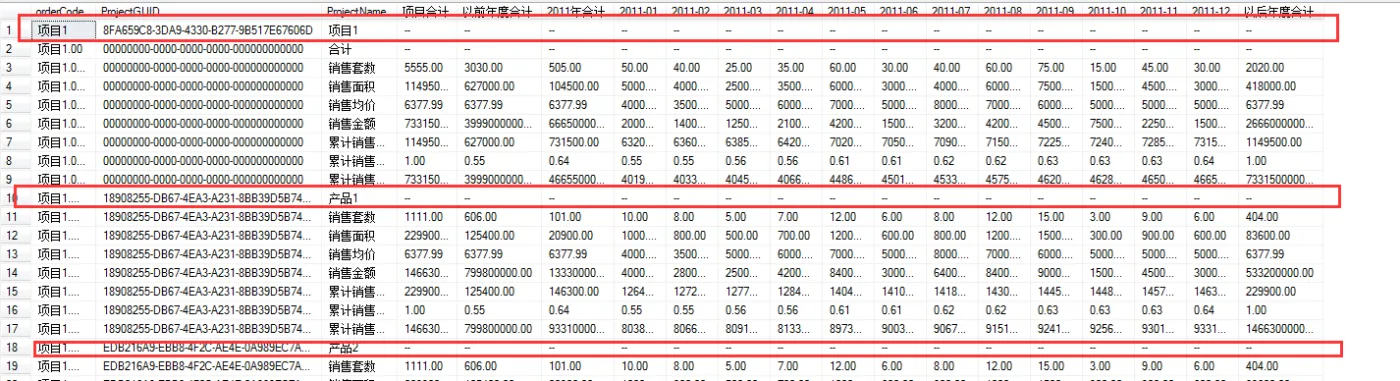 --从Project表中加入项目数据 select * from ( select ProjectName as orderCode,ProjectGUID,ProjectName, '--' AS '项目合计', '--' AS '以前年度合计', '--' AS '2011年合计', '--' AS '2011-01', '--' AS '2011-02', '--' AS '2011-03', '--' AS '2011-04', '--' AS '2011-05', '--' AS '2011-06', '--' AS '2011-07', '--' AS '2011-08', '--' AS '2011-09', '--' AS '2011-10', '--' AS '2011-11', '--' AS '2011-12', '--' AS '以后年度合计' from Project where ProjectGUID=@ProjectGUID ----项目1 8FA659C8-3DA9-4330-B277-9B517E67606D 项目1 -- -- -- -- -- -- -- -- -- -- -- -- -- -- -- -- union all --从产品表和Project表中加入合计行数据 select Project.ProjectName+'.'+a.ProductCode as orderCode,a.ProductGUID,a.ProductName, '--' AS '项目合计', '--' AS '以前年度合计', '--' AS '2011年合计', '--' AS '2011-01', '--' AS '2011-02', '--' AS '2011-03', '--' AS '2011-04', '--' AS '2011-05', '--' AS '2011-06', '--' AS '2011-07', '--' AS '2011-08', '--' AS '2011-09', '--' AS '2011-10', '--' AS '2011-11', '--' AS '2011-12', '--' AS '以后年度合计' from #product a left join Project on a.ProjectGUID=Project.ProjectGUID ----项目1 8FA659C8-3DA9-4330-B277-9B517E67606D 项目1 -- -- -- -- -- -- -- -- -- -- -- -- -- -- -- -- ----项目1.00 00000000-0000-0000-0000-000000000000 合计 -- -- -- -- -- -- -- -- -- -- -- -- -- -- -- -- ----项目1.产品1 18908255-DB67-4EA3-A231-8BB39D5B748B 产品1 -- -- -- -- -- -- -- -- -- -- -- -- -- -- -- -- ----项目1.产品2 EDB216A9-EBB8-4F2C-AE4E-0A989EC7A993 产品2 -- -- -- -- -- -- -- -- -- -- -- -- -- -- -- -- ----项目1.产品3 7040241F-5A66-4F17-AACA-7CBE2FB3BCB9 产品3 -- -- -- -- -- -- -- -- -- -- -- -- -- -- -- -- ----项目1.产品4 108778CD-47C0-4258-9CB6-1FBE90CDEBDA 产品4 -- -- -- -- -- -- -- -- -- -- -- -- -- -- -- -- ----项目1.产品5 43F7B9BA-EF91-4A38-A048-090179F33C9B 产品5 -- -- -- -- -- -- -- -- -- -- -- -- -- -- -- -- union ALL --从产品表和Project表、#tempSaleDtl3中加入类型行数据 select c.ProjectName+'.'+b.ProductCode+'.'+a.typecode as orderCode,a.ProductGUID, a.[type], cast(a.[项目合计] as varchar(20)), cast(a.[以前年度合计] as varchar(20)), cast(a.[2011年合计] as varchar(20)), cast(a.[2011-01] as varchar(20)), cast(a.[2011-02] as varchar(20)), cast(a.[2011-03] as varchar(20)), cast(a.[2011-04] as varchar(20)), cast(a.[2011-05] as varchar(20)), cast(a.[2011-06] as varchar(20)), cast(a.[2011-07] as varchar(20)), cast(a.[2011-08] as varchar(20)), cast(a.[2011-09] as varchar(20)), cast(a.[2011-10] as varchar(20)), cast(a.[2011-11] as varchar(20)), cast(a.[2011-12] as varchar(20)), cast(a.[以后年度合计] as varchar(20)) from #tempSaleDtl3 a left join #product b on a.ProductGUID=b.ProductGUID left join Project c on b.ProjectGUID=c.ProjectGUID ) t1 order by orderCode