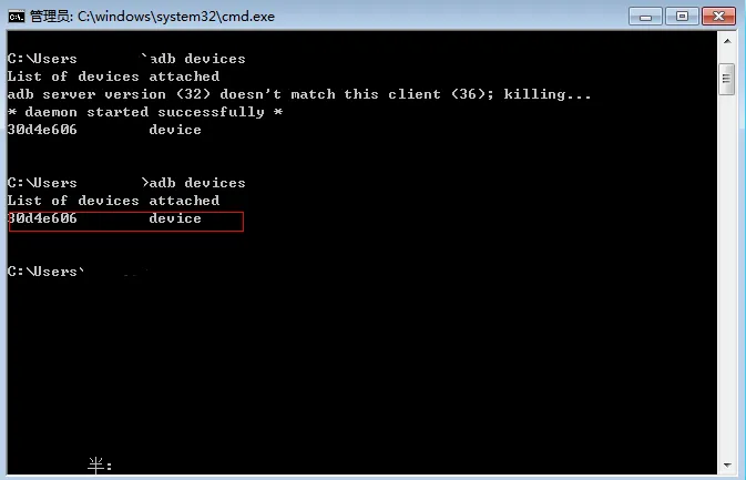 2.打开cmd输入:adb devices,当屏幕上出现一串字符,后面显示devices说明连接成功(出现其它的提示,得检查自己的环境了)