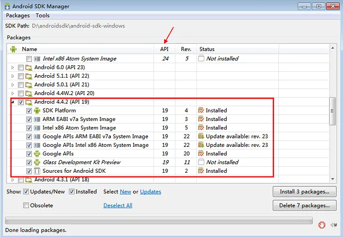 3.勾选你要现在的API版本和对应的android版本,后面模拟器会用到