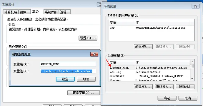 1.在系统变量新建:ANDROID_HOME,对应变量值为:D:\androidsdk\android-sdk-windows(sdk安装路径)