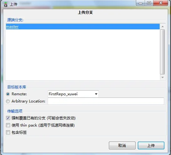 勾选强制覆盖已有的分支(可能会丢失改动),再点击上传,上传成功。