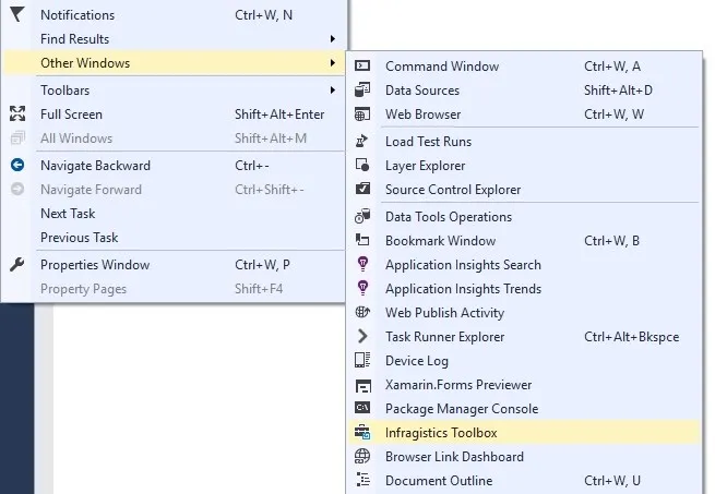 提示:当您首次为Xamarin安装Infragistics Ultimate UI时,该工具箱不会显示在VS中。 您必须手动显示工具箱,方法是转到Visual Studio中的“视图”>“其他Windows”>“Infragistics Toolbox”。