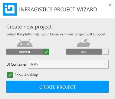 接下来,您可以使用Infragistics Xamarin.Forms项目向导选择要定位的平台。 这是我最喜欢的功能之一,因为我并不总是想要瞄准每一个可用的平台。