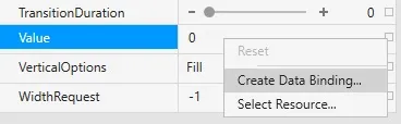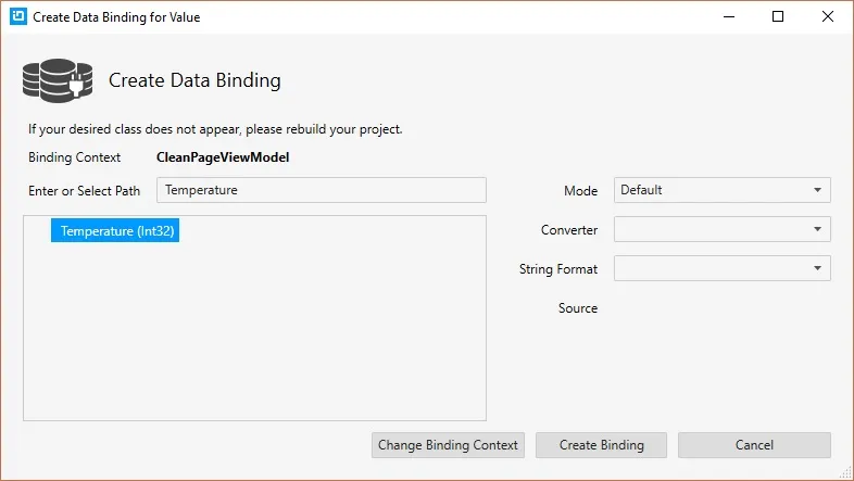 接下来,单击创建数据绑定菜单选项。 您将看到一个对话框,您可以使用它来完全按照您的要求创建绑定。 设置绑定路径,模式,转换器(是的,它将自动找到所有转换器),并提供一个字符串格式。