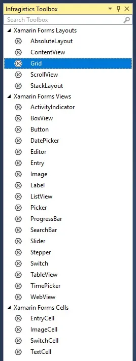 如您所见,Infragistics Xamarin.Forms工具箱提供了Xamarin所有可用的所有标准Xamarin.Forms布局,视图和单元格。 这使得从工具箱拖动元素并将其放到XAML文件上是非常简单的,这将在放置点插入XAML代码段。
