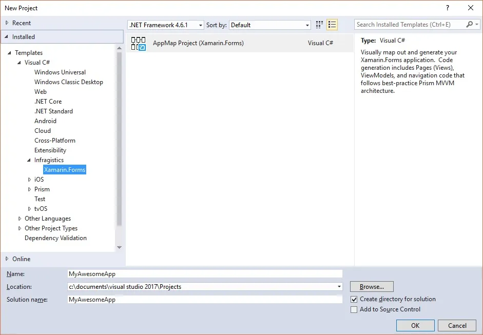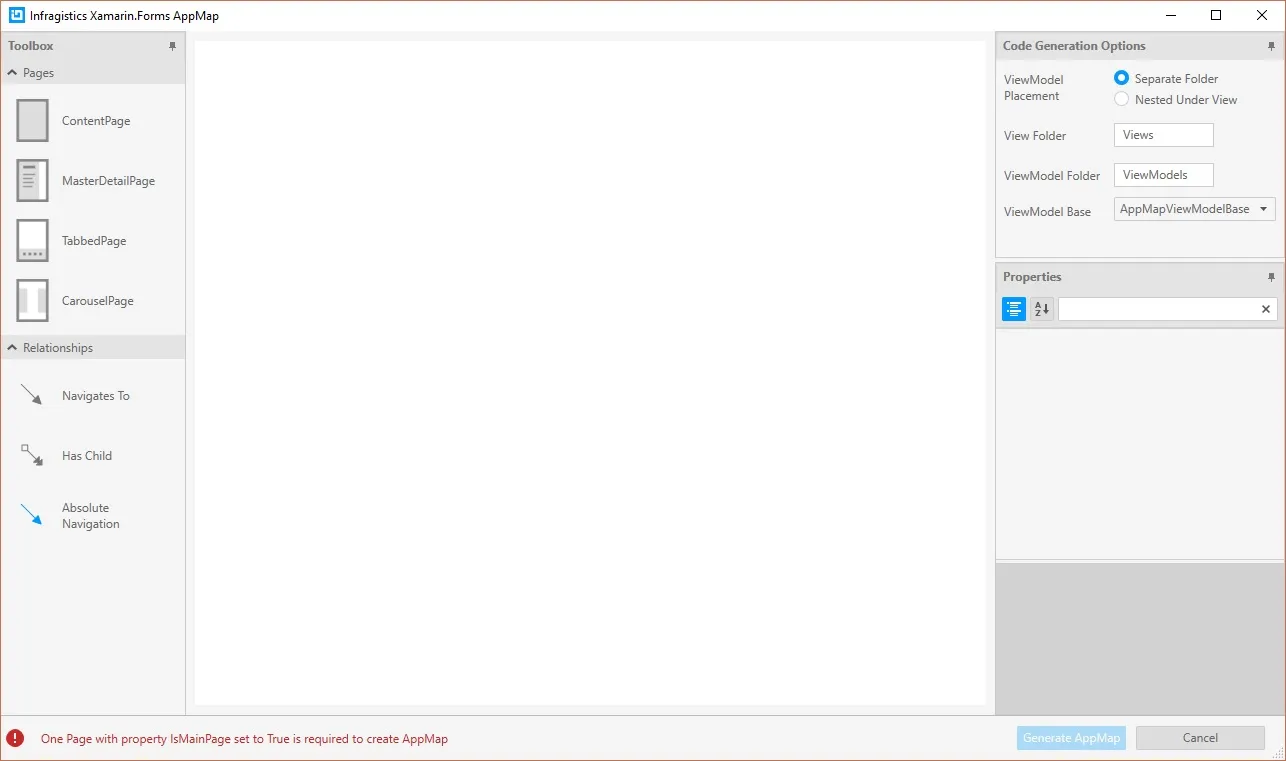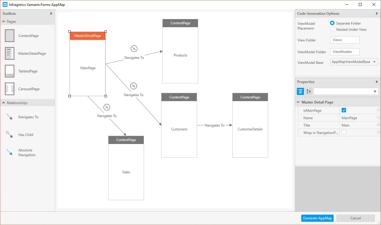 对于AppMap,基于最佳模式和实践生成一个良好的架构的MVVM应用程序,它必须具有某种类型的应用程序框架,以生成可靠的MVVM友好代码。 Infragistics确定了Prism库是最好的Xamarin.Forms应用程序框架,并且基于Prism中可用功能的所有生成代码。