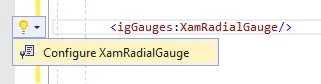 你怎么启动它?将Infragistics Xamarin.Forms控件拖动到XAML编辑器后,单击控件名称将鼠标光标放在控件XAML中。当您这样做时,您将看到Visual Studio建议灯泡出现。打开建议灯泡,您会看到一个名为“配置[ControlName]”的菜单选项。由于我使用XamRadialGauge,菜单项说“配置XamRadialGauge”。就个人而言,我喜欢使用CTRL +。快捷方式启动建议灯泡。