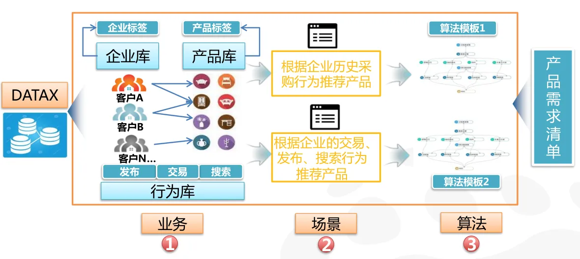 当我们用产品时关注的是什么?数加提供的是相对简易的搭建流程,包括新建业务、新建场景、新建算法,就可以实现大数据个性化推荐引擎的搭建。第一步是最重要的,我们需要梳理业务,根据业务目的配置推荐行为,我们建企业库和产品库是看企业喜欢什么产品,这个产品如果在我的产品目录库里,就认为他是我默认的一个潜在客户,所以我们是通过转换方式来确定我们推荐什么,我们搜集了大量数据,目前大约有60多个企业标签,我们也在梳理产品的品类、规格,形成了产品标签。关于行为库,包括发布、交易、搜索的行为,梳理完这些业务,实际上已经完成模型的初步搭建了。