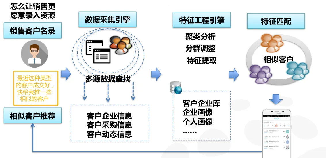 另外,在找客户上我们做了更多的事情,我们发现使用我们产品的企业,当销售有一些诉求时,可以提供这类的清单,数据采集引擎自动补全客户信息,再通过特征功能引擎归纳出企业相应的行为特征、画像,然后提取相关特征,在精准的企业库里找到相似的匹配。