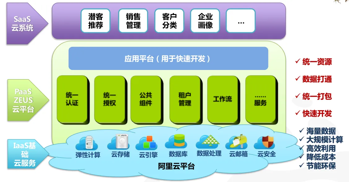 阿里云已经提供了对于云端的一整套解决方案以及产品,我们想跟阿里云有一个更加深入的对接,我公司本身有多个SaaS产品存在,所以构建了PaaS ZEUS云平台,PaaS ZEUS云平台目前包括统一认证、统一授权、公共组件的定义、自定义工作流、多租户模型管理以及我们应用平台的快速开发,来配合整个SaaS架构的运行。