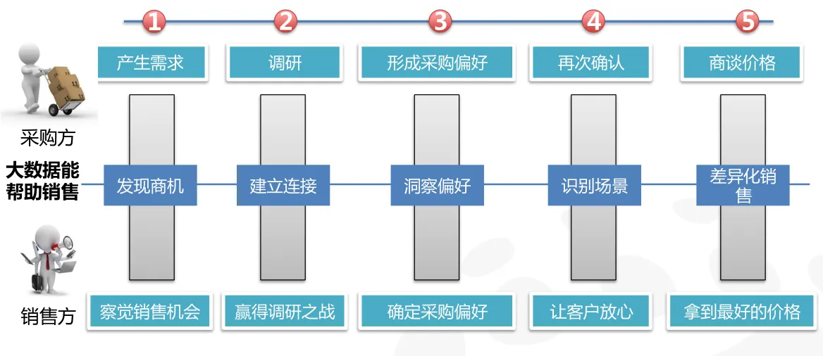 通过大数据建立连接客户开展营销的能力。我们在研究整个场景化销售的过程中,通过市场经济的开展,供需关系已经发生了变化,市场开始出现饱和,企业更加关心的是在哪里找到客户、了解客户、明晰客户决策场景、推动客户购买决策。他们希望通过大数据应用为他们寻找更多的商业机会以及创造更多的商业价值,我们称之为用数据定位用户、用数据洞察用户、用数据识别场景、用数据影响决策。在实际的使用场景中会体现为,通过精准的客户推荐为企业找到客户,通过可视化的客户画像让企业更好的洞察,通过数据识别场景告诉你的客户当前处在哪个阶段,通过哪些触点来触发它,影响他的销售决策。